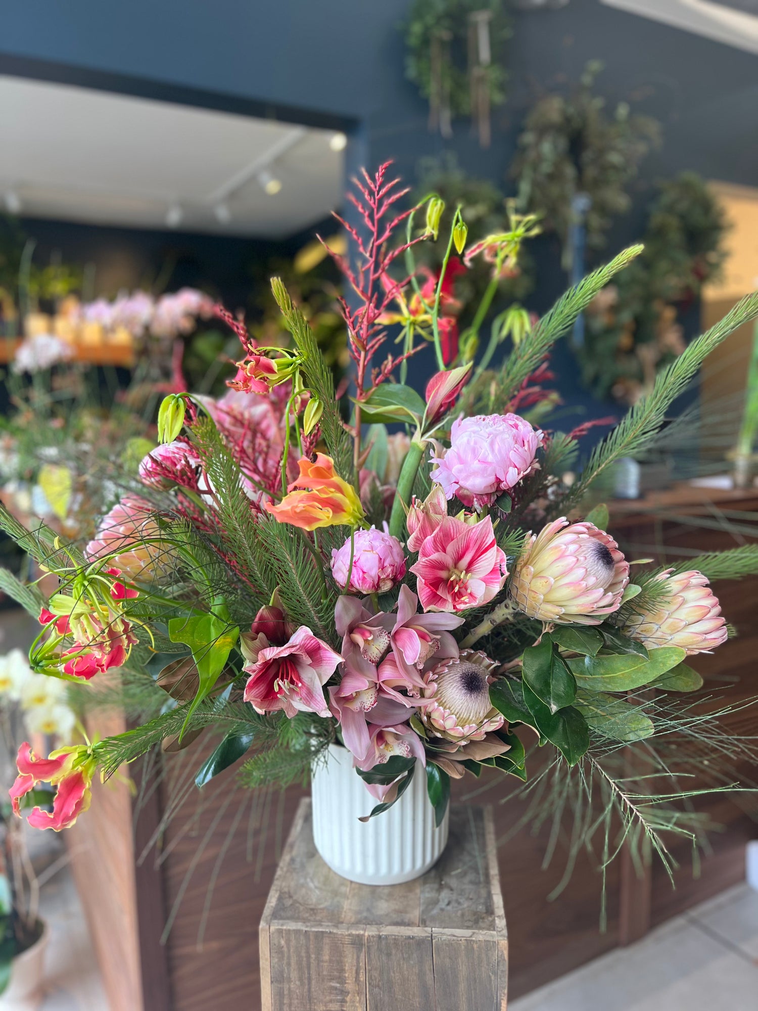 Flowers vary due to seasonal availability (which we love!)— our creative florists strive to select the freshest blooms for your flower arrangement and make sure every one is unique. Have a special request? Let us know in the order notes section of this page before adding the arrangement to your cart!